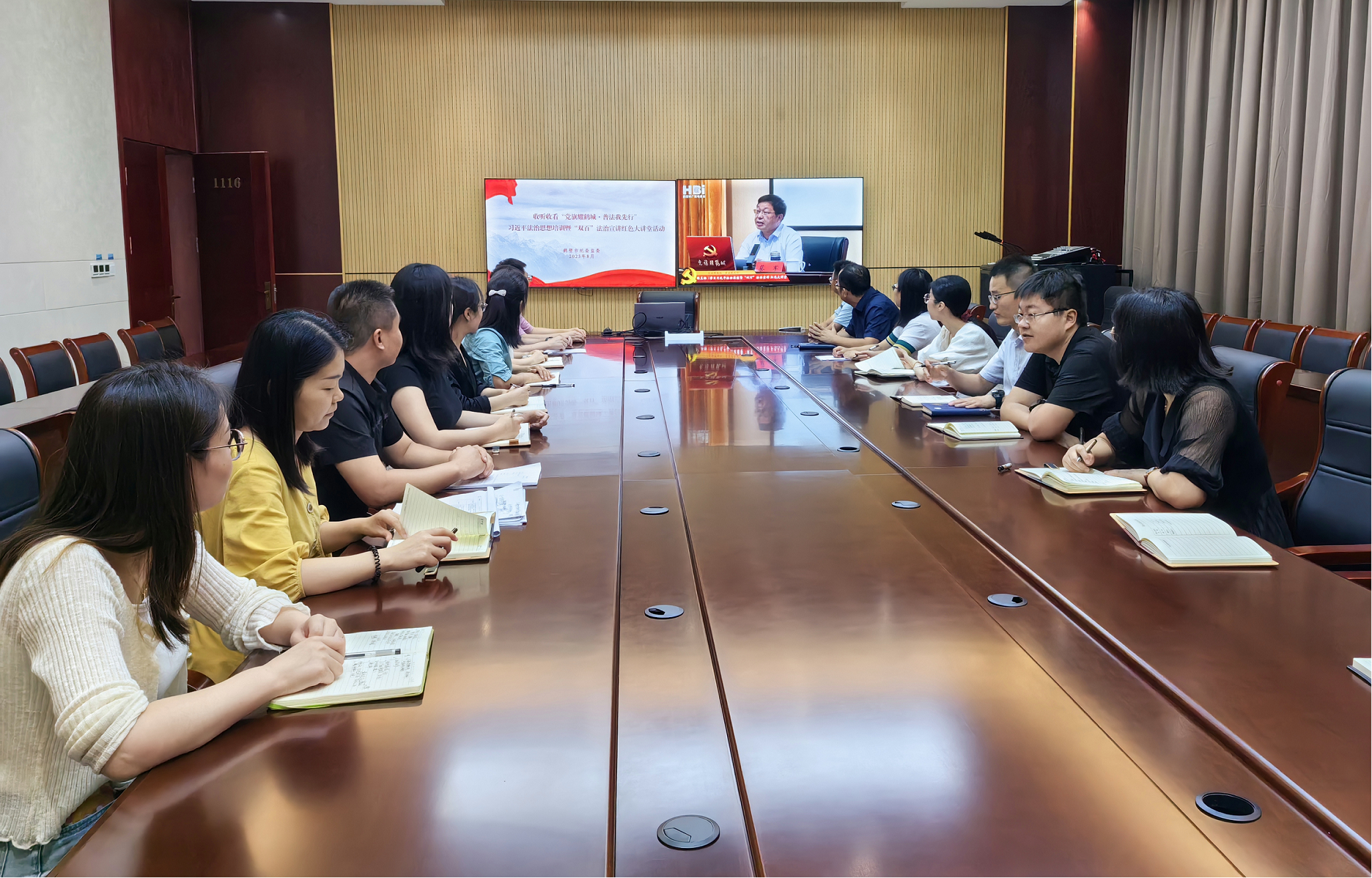 8月11日,市纪委监委组织收听收看“党旗耀鹤城 普法我先行”习近平法治思想培训暨“双百”法治宣讲红色大讲堂,深入学习习近平法治思想,引导纪检监察干部树立法治思维,做社会主义法治的忠实崇尚者、自觉遵守者、坚定捍卫者。