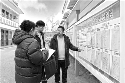 河南省濮阳市纪委监委推动加大农村集体“三资”公示公开力度,督促各村(社区)综合运用管理平台、村务公开栏等,及时公开“三资”管理使用情况。图为近日,该市台前县纪检监察干部在后方镇王楼村查看公开公示情况。张乐斌 摄