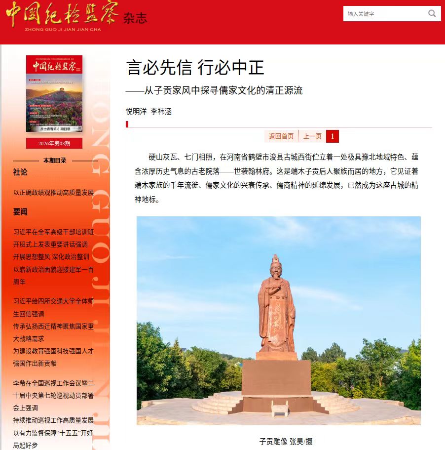 近日,2026年第8期《中国纪检监察》杂志中华好家风巡礼栏目,以“言必先信 行必中正 ——从子贡家风中探寻儒家文化的清正源流”为题,采用图文宣传形式,浓墨重彩对我市历史文化和纪检监察工作进行深度报道,现予以全文转载,以飨读者。