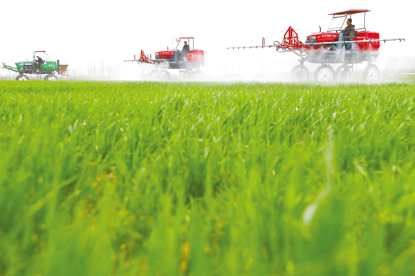 在山东省青岛市即墨区,自走式高杆喷雾机在田地里作业。 新华社发(梁孝鹏 摄)