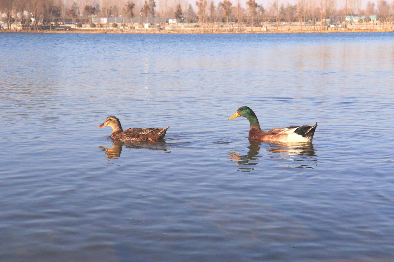 鹤壁披烟园的湖水漾着清波,两只野鸭悠然游弋,仿若重现《诗经》里“凫鹥在泾”的画面。远处树木静立,与游鸭一同勾勒出冬日的静谧。(驻市司法局纪检监察组 王素军 摄)