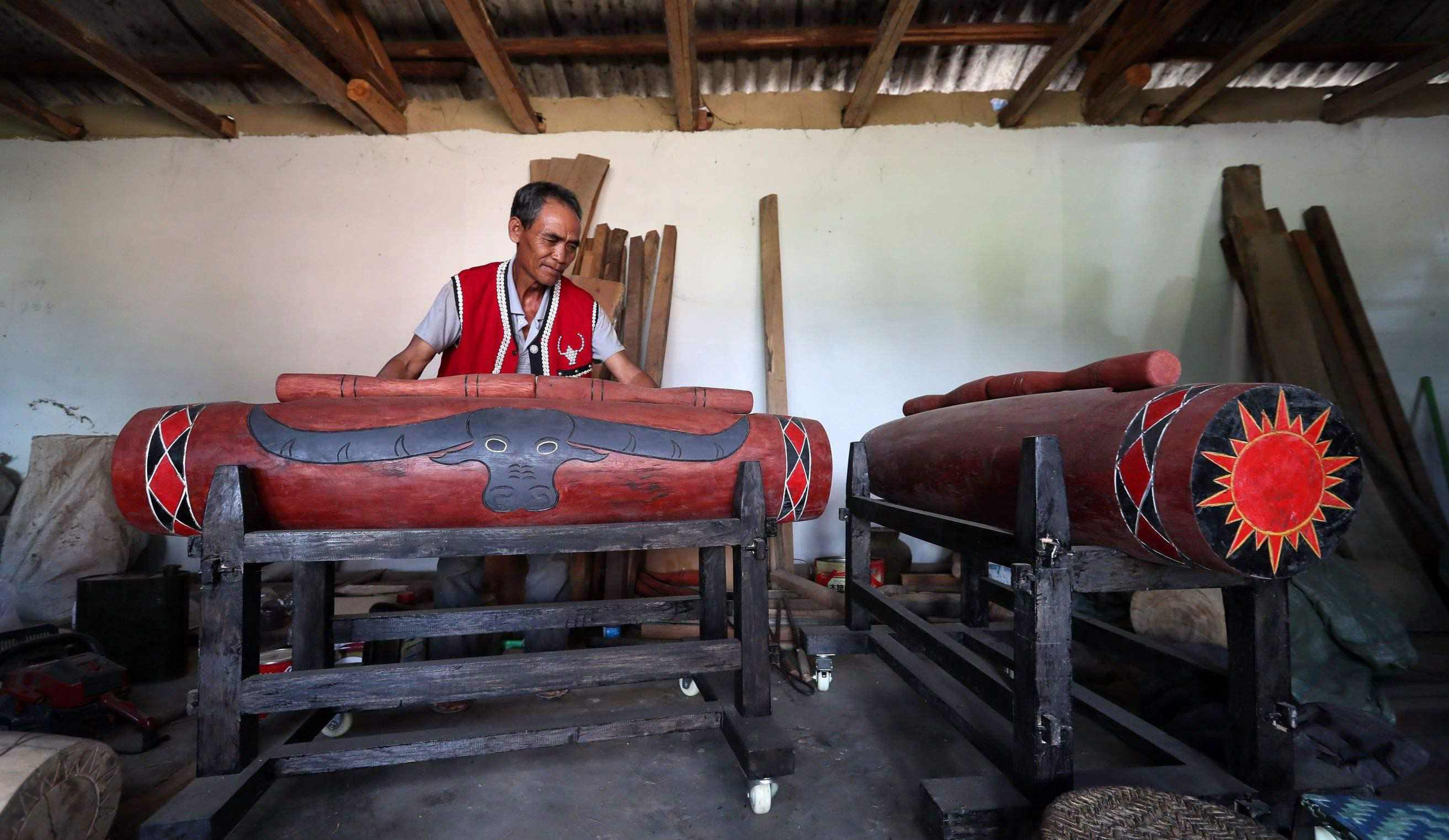 木鼓上的牛头引人注目。据了解,木鼓是佤族圣母玛奴姆的象征,水牛是玛奴姆的救命恩人,木鼓和水牛便成了各地佤族共同信仰,也是佤族最具体的、最典型的、最有代表性的图腾。