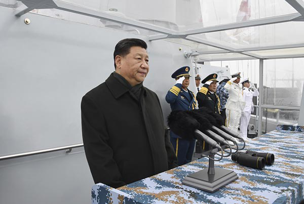 4月23日,在中国人民解放军海军70华诞之际,中共中央总书记、国家主席、中央军委主席习近平出席在青岛举行的庆祝人民海军成立70周年海上阅兵活动。图为习近平检阅舰艇编队。新华社记者 李刚 摄