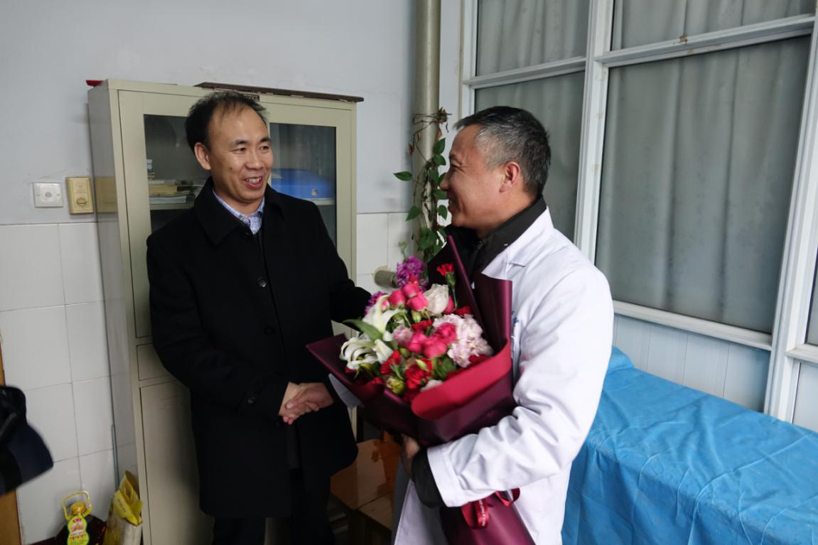 在市中医院,冯芳喜看望我市名医丁庆学,希望他发挥传帮带作用,培养更多优秀的专业医疗人才,为发展人民满意的医疗卫生事业作出新贡献。(市纪委监委)