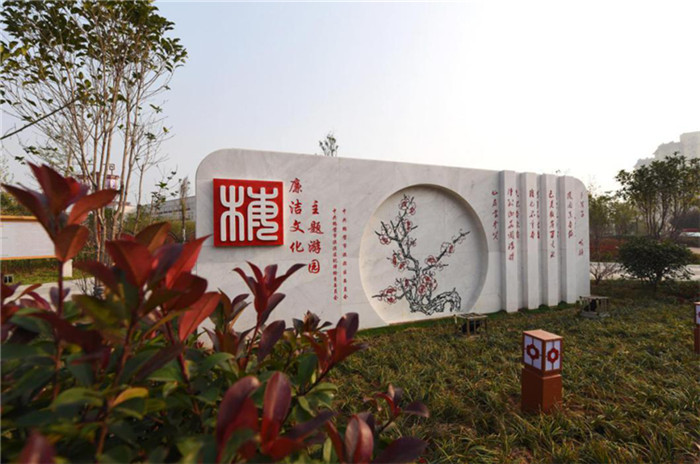 游园入口处,迎面为“梅花”主题影壁墙,中间镂刻梅花造型,右边为毛泽东手书体咏梅词《卜算子.咏梅》,突出梅与廉洁的主题。