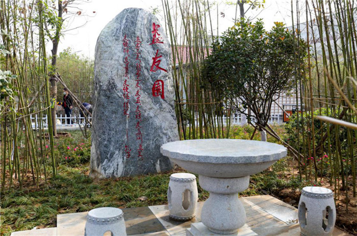 “益友园”:“益者三友——友直,友谅,友多闻,益矣。”将孔子对益友的解读与棋盘寓意相融合,告诫世人慎交友。