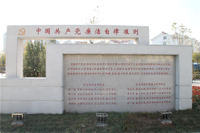 廉洁自律准则墙:出口处设置廉洁自律准则墙,雕刻《中国共产党廉洁自律准则》,时刻提醒党员干部继承发扬党的优良传统和作风,自觉培养高尚道德情操,努力弘扬中华民族传统美德,廉洁自律,接受监督,永葆党的先进性和纯洁性。(鹤壁市纪委)