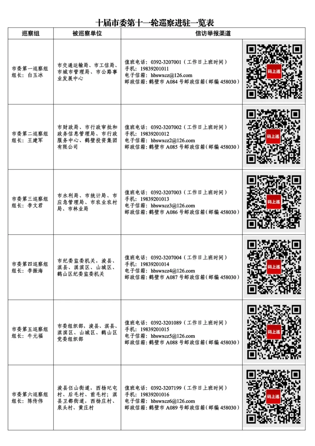 本轮巡察时间为两个半月左右。巡察期间,各市委巡察组设立专门值班电话、接收短信手机、邮政信箱、“码上巡”等信访举报方式,主要受理反映被巡察单位领导班子及其成员、下一级党组织主要负责人和重点岗位人员问题的来信来电来访,重点是关于违反政治纪律、组织纪律、廉洁纪律、群众纪律、工作纪律、生活纪律等方面的举报和反映。