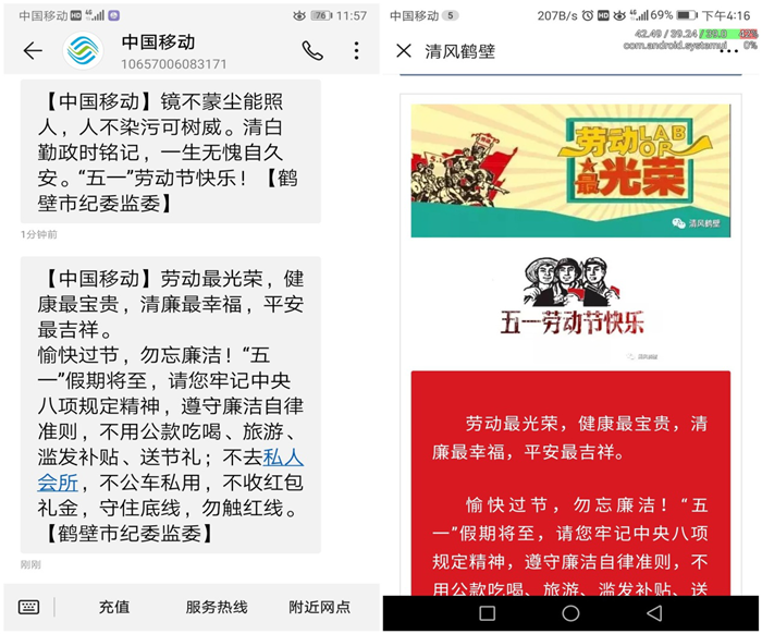 “愉快过节,勿忘廉洁!‘五一’假期将至,请您牢记中央八项规定精神,遵守廉洁自律准则,不用公款吃喝、旅游、滥发补贴、送节礼;不去私人会所,不公车私用,不收红包礼金,守住底线,勿触红线。”4月28日,浚县善堂镇党委书记李文君接到了市纪委监委群发的手机廉政提醒短信。