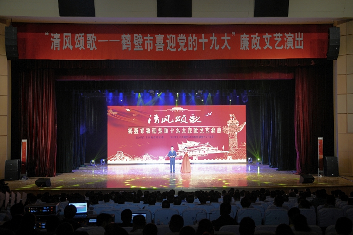 "朗朗乾坤正气歌,浩气长存天地间。”为进一步加强鹤壁廉政文化建设,推进全面从严治党向纵深发展,为党的十九大胜利召开营造良好氛围,9月26日晚,“清风颂歌——鹤壁市喜迎党的十九大”廉政文艺演出在市人民会堂精彩上演。市委书记范修芳,市长唐远游,市领导桂玉强、史全新、于燕、张友书等与1300余名党员干部群众一同观看演出。