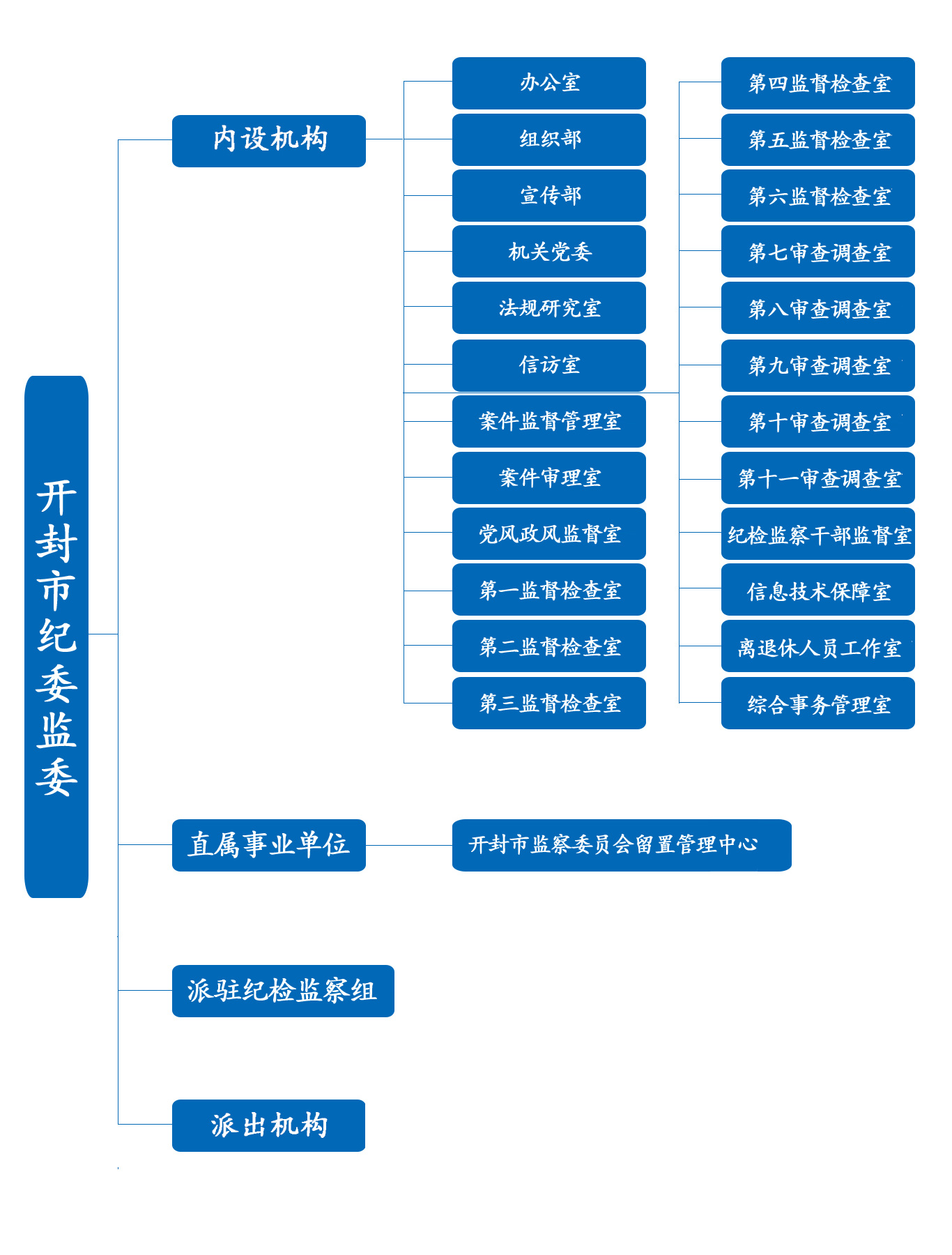 开封市纪委机关与开封市监委合署办公,共有24个内设机构,分别为:办公室、组织部、宣传部、机关党委、法规研究室、信访室、案件监督管理室、案件审理室、党风政风监督室、第一至第六监督检查室、第七至第十一审查调查室、纪检监察干部监督室、信息技术保障室、离退休人员工作室、综合事务管理室。下属1个事业单位:开封市监察委员会留置管理中心派驻及派出机构39个。