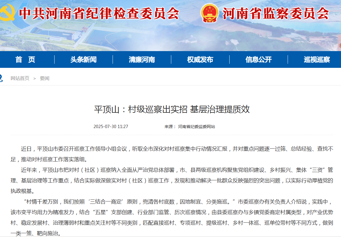 近年来,平顶山市把对村(社区)巡察纳入全面从严治党总体部署,市、县两级巡察机构聚焦党组织建设、乡村振兴、集体“三资”管理、基层治理等工作重点,结合实际做深做实对村(社区)巡察工作,发现和推动解决一批群众反映强烈的突出问题,以实际行动厚植党的执政根基。