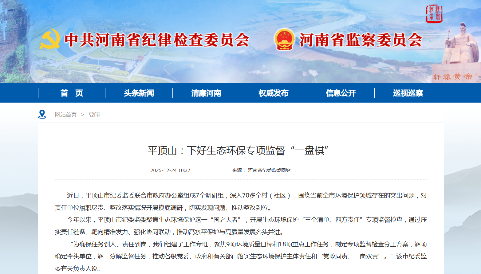 今年以来,平顶山市纪委监委聚焦生态环境保护这一“国之大者”,开展生态环境保护“三个清单、四方责任”专项监督检查,通过压实责任链条、靶向精准发力、强化协同联动,推动高水平保护与高质量发展齐头并进。