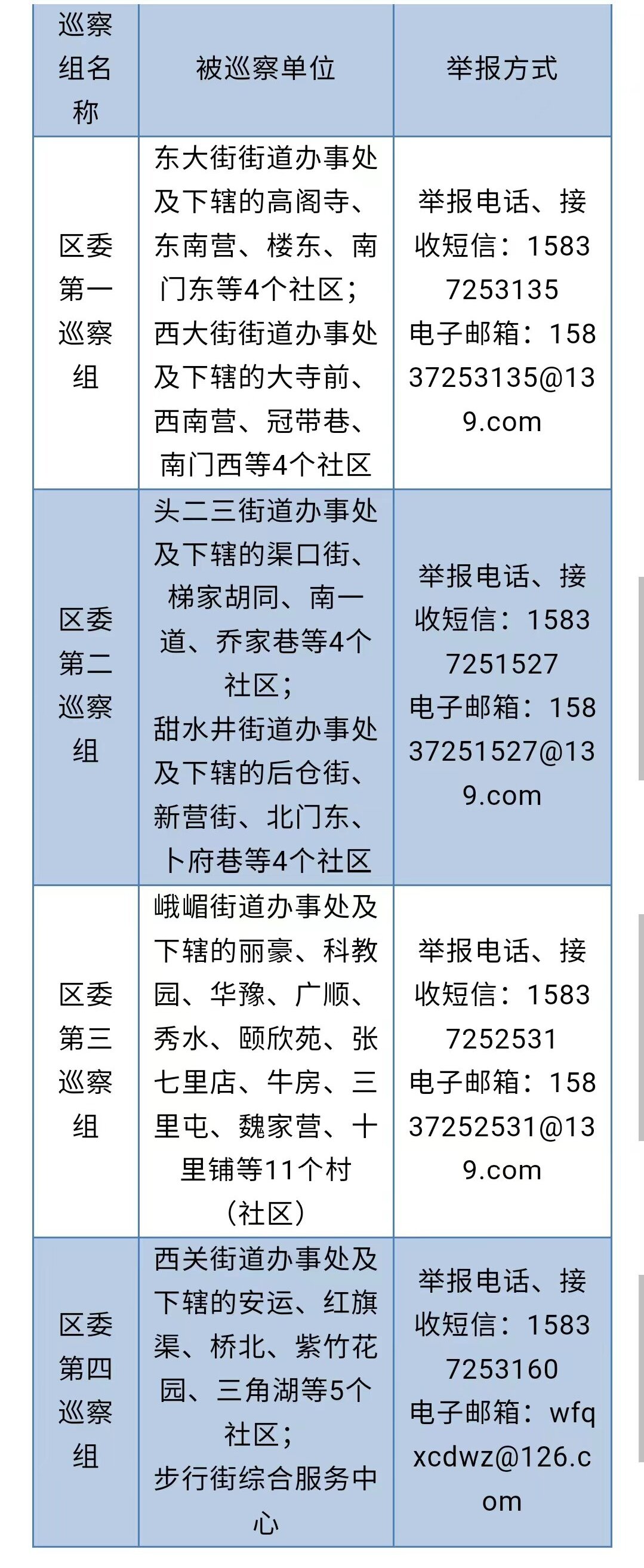 根据区委统一安排部署,2023年3月10日至2023年4月30日对东大街、西大街、头二三、甜水井、西关、峨嵋等6个街道办事处和步行街综合服务中心开展常规巡察;对东大街街道下辖的高阁寺、东南营、楼东、南门东等4个社区;西大街街道下辖的大寺前、西南营、冠带巷、南门西等4个社区;头二三街道下辖的渠口街、梯家胡同、南一道、乔家巷等4个社区;甜水井街道下辖的后仓街、新营街、北门东、卜府巷等4个社区;西关街道下辖的安运、红旗渠、桥北、紫竹花园、三角湖等5个社区;峨嵋街道下辖的丽豪、科教园、华豫、广顺、秀水、颐欣苑、张七里店、牛房、三里屯、魏家营、十里铺等11个村(社区)进行巡察。根据巡视巡察工作有关规定,本轮巡察坚持以习近平新时代中国特色社会主义思想为指导,把“两个维护”作为根本任务,紧扣被巡察单位职能责任,紧扣巡察“三个聚焦”,主要受理反映被巡察街道党政领导班子及其成员、各村(社区)支部及其成员问题的来信来访,重点是关于违反政治纪律、组织纪律、廉洁纪律、群众纪律、工作纪律和生活纪律等方面的举报和反映。其他不属于巡察受理范围内的个人诉求、征地拆迁、涉法涉诉等信访问题,将按分级负责、属地管理原则,转交有关部门处理。。