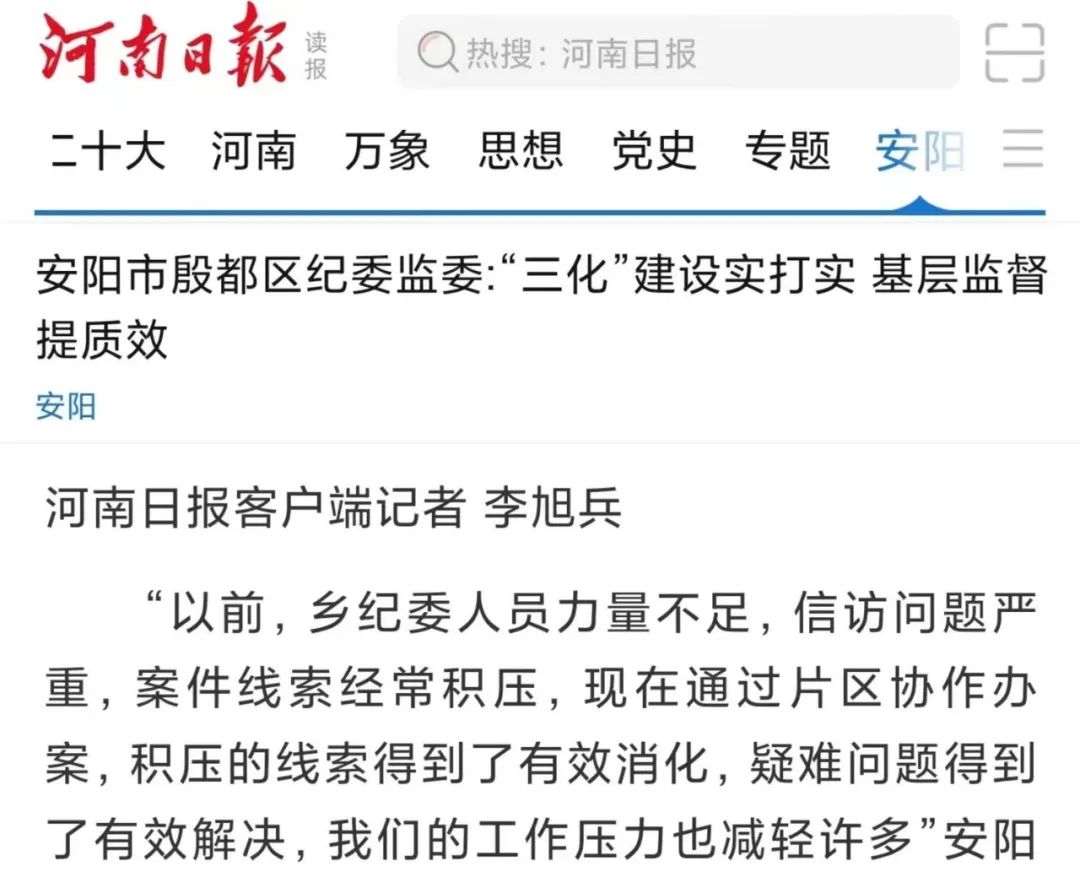 “以前,乡纪委人员力量不足,信访问题严重,案件线索经常积压,现在通过片区协作办案,积压的线索得到了有效消化,疑难问题得到了有效解决,我们的工作压力也减轻许多”安阳市殷都区磊口乡纪委书记刘柯楠提到基层“三化”建设时感慨道。