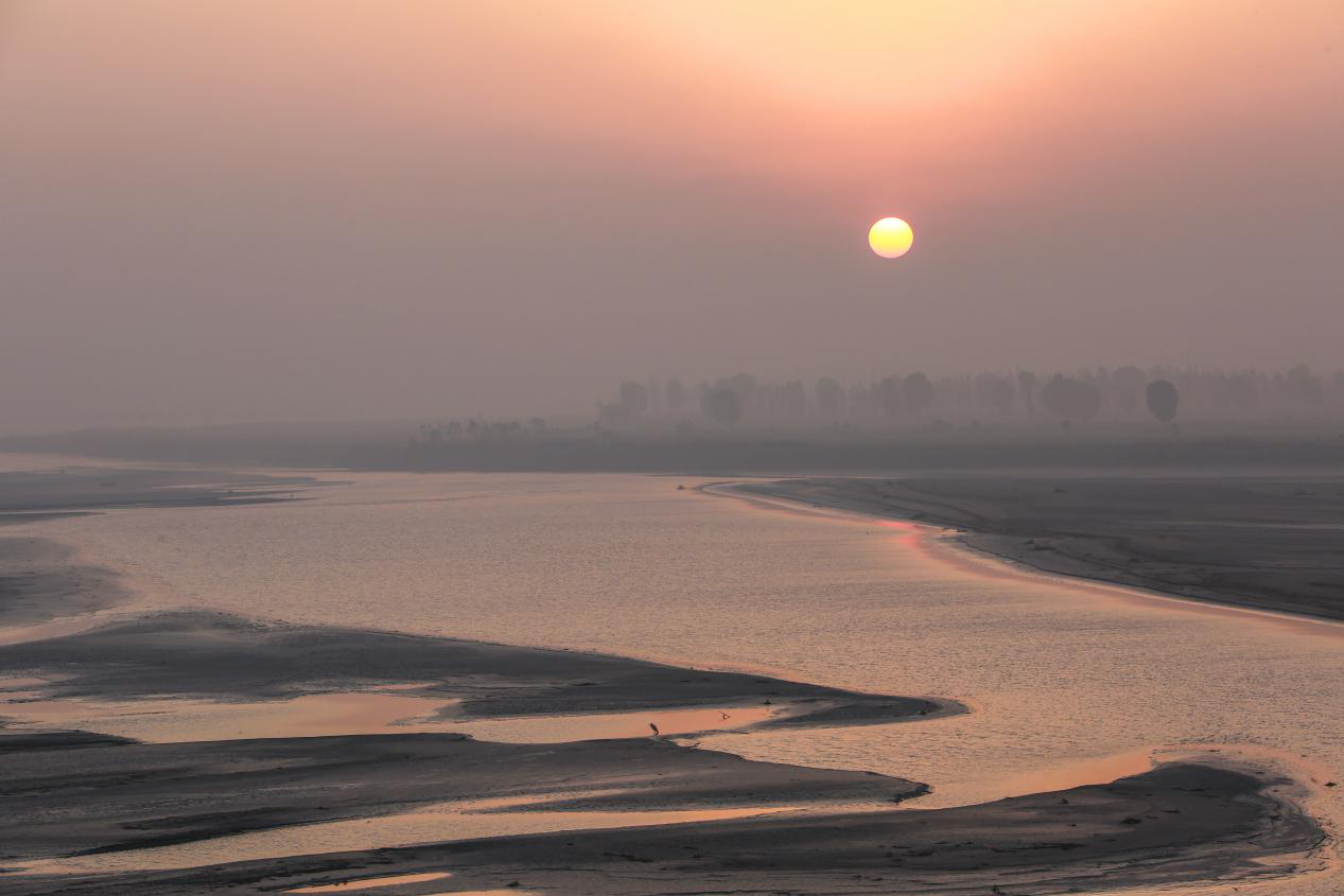 初冬时节,封丘黄河滩区水面铺上一层薄冰,落日下,曾经咆哮的河水瞬间变得如此宁静。